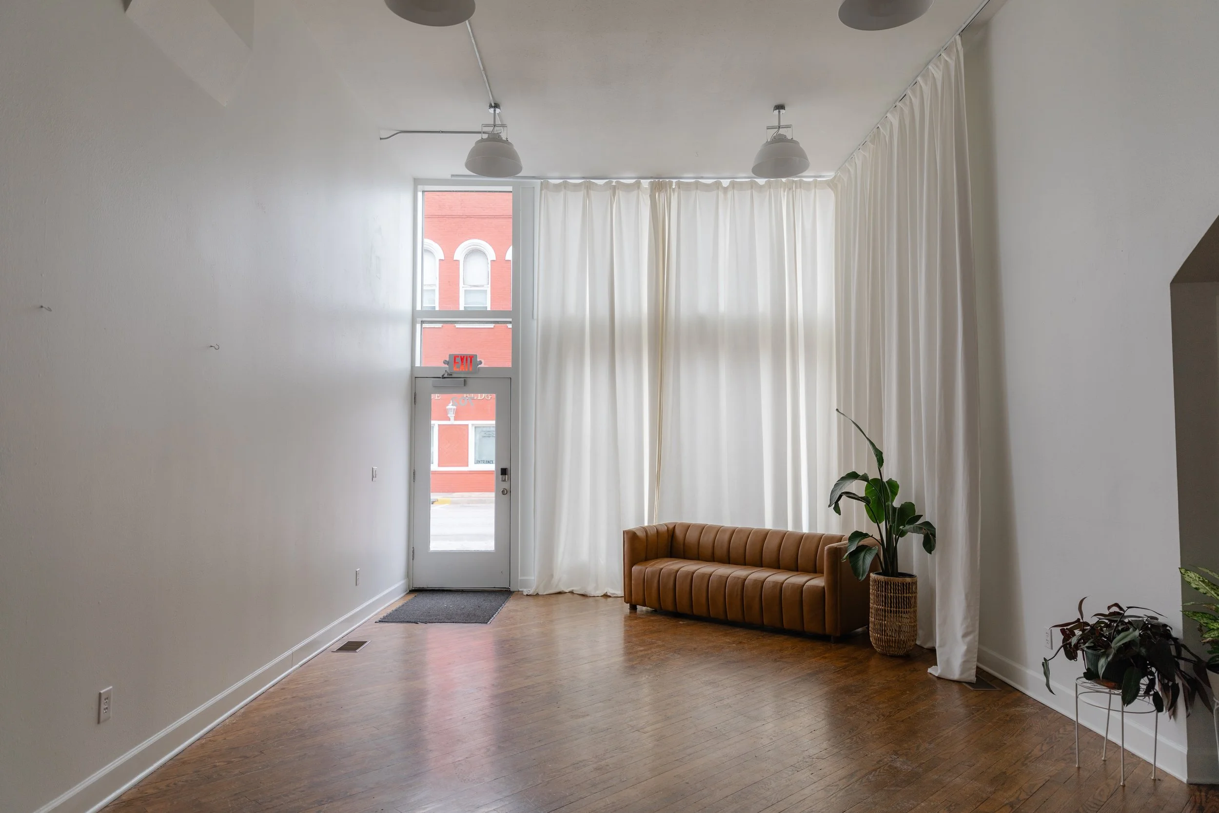 Enjoy a naturally lit space with 14' ceilings and windows draped in dreamy cream curtains. Play with our curated props and backdrops, or bring your own to make the space truly yours and tailor it to your client's vision.